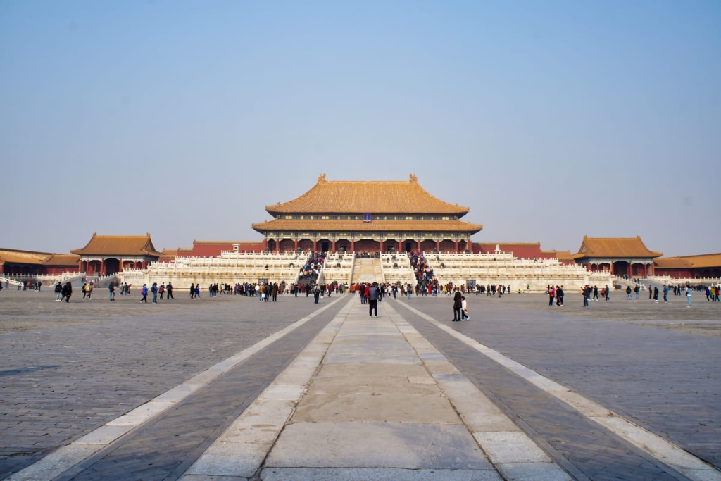Unter den wachsamen Augen des Portraits von Mao Zedong geht ihr durch das Tiananmen-Tor und betretet die Verbotene Stadt, einen 180 Hektar großen Komplex, der 980 Gebäude mit 8.000 Zimmern beherbergt. Bis zum 20. Jahrhundert war Normalsterblichen der Zugang verwehrt – daher der Name. Ganze 24 Kaiser haben hier 500 Jahre lang residiert, dementsprechend viel gibt es zu sehen. Drei bis vier Stunden solltet ihr für euren Besuch mindestens einplanen. Und selbst dann habt ihr gerade einmal genug Zeit für die wichtigsten Plätze und Paläste. Wirklich alles in der Verbotenen Stadt zu sehen, nimmt einen ganzen Tag in Anspruch. Wochenenden und Nationalfeiertage solltet ihr aufgrund der Menschenmassen tunlichst meiden. Am besten kommt ihr am frühen Morgen oder am späten Nachmittag hierher. Die Verbotene Stadt öffnet um 08:30 Uhr und schließt ihre Tore um 17:00 Uhr, im Winter bereits um 16:30. Umgerechnet 7,60 Euro kostet der Eintritt zwischen April und Oktober, von November bis März sind es nur 5 Euro. Habt ihr es in die Verbotene Stadt geschafft, könnt ihr euch über die riesigen Plätze bewegen, auf denen einst die wichtigsten Zeremonien des Kaiserreichs stattfanden. Neben Palästen wie der Halle der höchsten Harmonie mit ihrem Kontrast aus rotem Holz und goldenen Ornamenten beherbergt die Verbotene Stadt auch die wertvollsten Artefakte des Landes – von goldenen Gefäßen über Seidenteppiche bis zu filigranen Uhren. Nachdem ihr die Verbotene Stadt durch das Nordtor wieder verlassen habt, solltet ihr noch zu den nordöstlichen Wachtürmen gehen, die sich malerisch im Wassergraben spiegeln. Ein Besuch des Jingshan Park rundet euren Ausflug ab. Von der auf einem künstlichen Hügel gelegenen Gartenanlage habt ihr einen guten Überblick über den Palastkomplex.