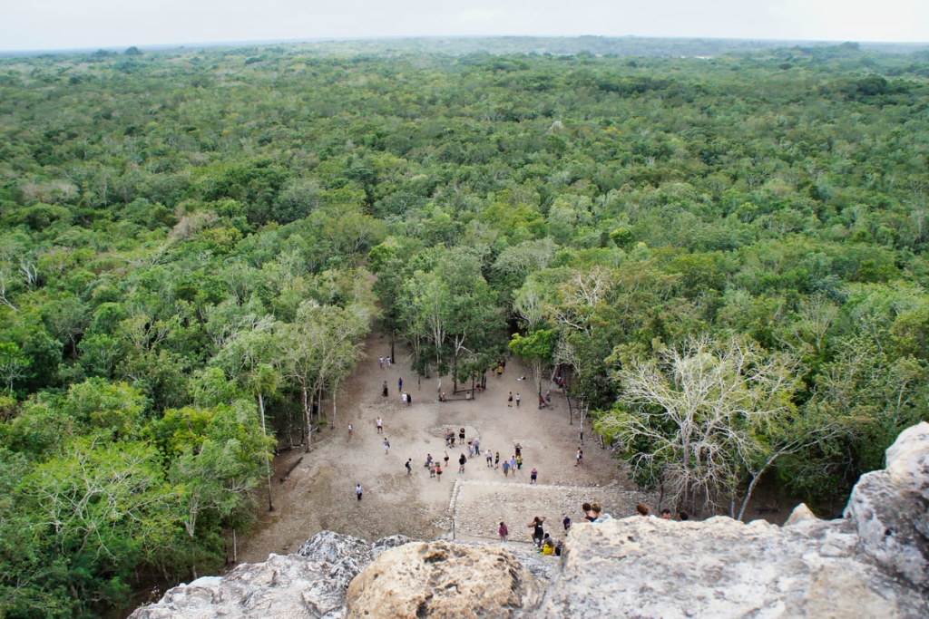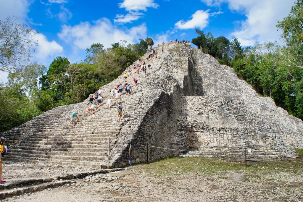 Coba ist cool! Die Ruinenstätte der Maya wartet im Osten Yucatans auf Besucher, die sich wie Entdecker und Archäologen fühlen möchten. Vom Parkplatz aus führt ein etwa 1,5 Kilometer langer Fußweg zu den Ruinen. Deutlich bequemer ist die Fahrt mit einer Fahrrad-Rikscha. Hin- und Rückfahrt für zwei Personen kosten keine zehn Euro. Der Eintrittspreis von 3,50 Euro wird am Eingang entrichtet. Auf dem Weg zur NohochMul-Pyramide stehen einige kleinere Tempel. Diese könnt ihr euch auch ansehen – müsst es aber nicht. Ganz anders sieht es mit der großen Maya-Pyramide aus. Fast unberührt steht sie da, als wäre sie noch vor wenigen Jahren Schauplatz von religiösen Zeremonien gewesen. Dabei ist dieser Ort weit über 1000 Jahre alt. Der Aufstieg dauert einige Minuten und ist nichts für Feiglinge: Weitestgehend ungesichert, über unebene Stufen, nur mit einem Seil zum Festhalten – so erklimmt ihr den steinernen Koloss. Etwa 40 Meter ragt die Pyramide aus dem Urwald heraus. Die Aussicht ist ganz nett, mehr aber auch nicht. Trotzdem ist man hier oben selten alleine, denn alle Touristen brauchen eine Pause. Absicherungen sind Fehlanzeige. Wer die Stätte mit Kindern besucht, sollte das berücksichtigen. Der Abstieg über die mehr als 100 Stufen ist beinahe noch anstrengender als der Aufstieg. Hier gilt es, möglichst das Seil zu nutzen. Unten angekommen kann man den Blick noch einmal schweifen lassen. Wer vorher über die vielen Touristen geschmunzelt hat, die hinauf- und hinunterkraxeln, wird sich das jetzt verkneifen. Nicht wenige legen den Weg auf allen Vieren zurück – ein evolutionärer Rückschritt der besonderen Art.