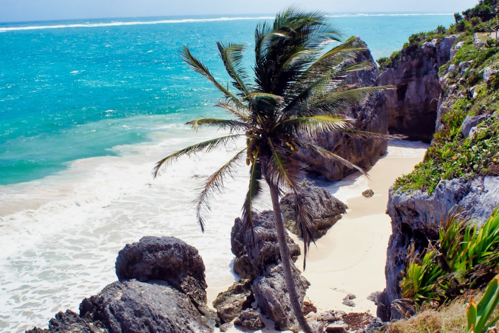 Bereits die Mayas wussten, was schön ist: Touristen, die Yucatans berühmte Tempel am Meer besuchen möchten, sollten allerdings gut zu Fuß sein. Denn die Autos bleiben locker 1,5 Kilometer entfernt vom Eingangsbereich der Anlage stehen. Außerdem wird es hier mitunter sehr heiß. Ihr solltet die letzten Einkaufsmöglichkeiten also unbedingt nutzen und euch mit ausreichend Wasser eindecken. Mit umgerechnet 3 Euro hält sich der Eintrittspreis, wie so oft in Mexiko, in Grenzen. Auf die Besucher wartet ein schöner Rundweg durch Maya-Ruinen, begleitet von sanftem Meeresrauschen – ein Moment, der für immer bleibt. Ihr solltet ihn unbedingt genießen, denn weder Fotos noch Videos oder Berichte können diese Faszination greifbar machen. Die Ruinen selbst sind leider nicht begehbar. Doch ein ruhiger Spaziergang durch die gepflegte und ansprechende Stätte entschädigt für dieses Manko. Der wohl bekannteste Sakralbau der Anlage ist der Tempel des Windes. Er wurde nur wenige Meter von den Steilklippen über dem Meer erbaut. Unmittelbar darunter seht ihr nichts als strahlend weißen Sand und Wasser in leuchtenden Türkis-Tönen. Ein Postkartenmotiv, wie es schöner kaum sein könnte.